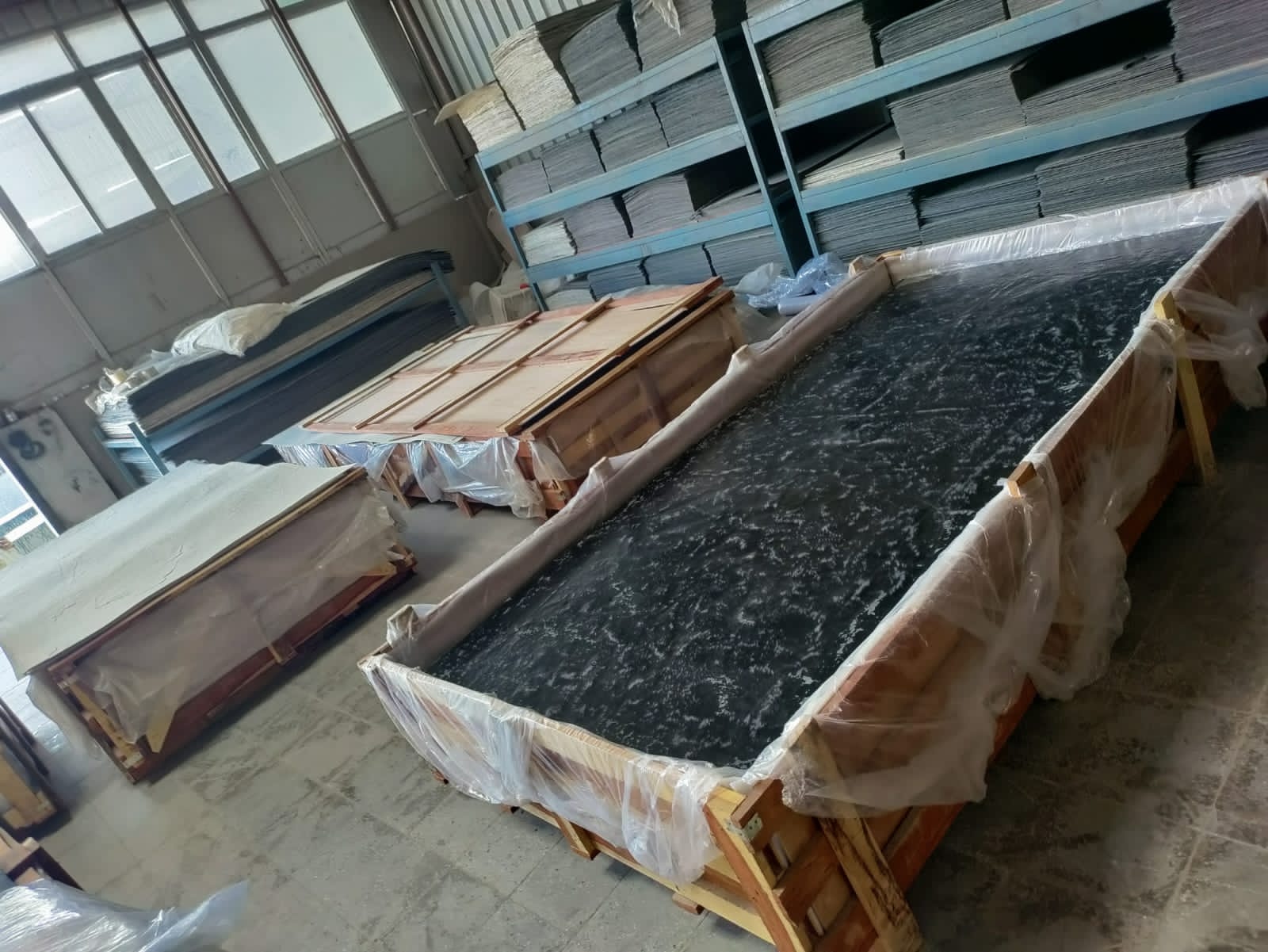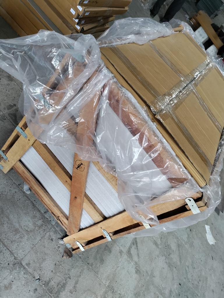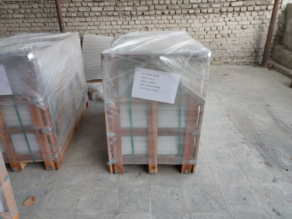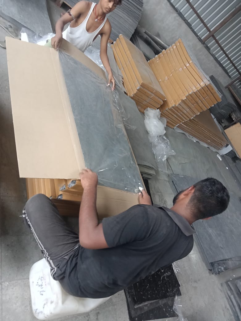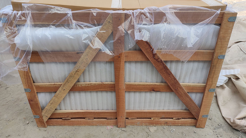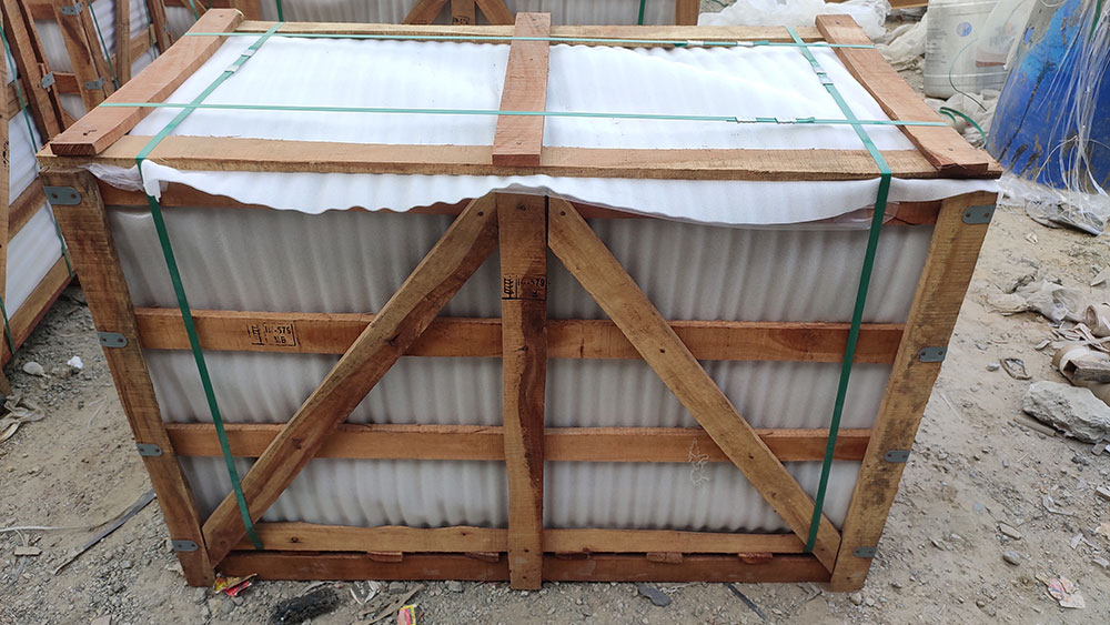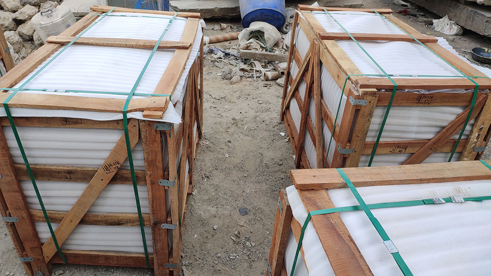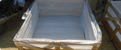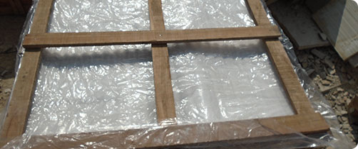 The next step is to secure the inner part of the crate by using a polythene and foam sheet on all sides which helps in preventing the damage of stone edges.